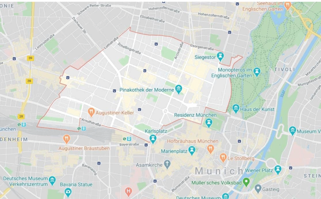Această zonă începe la Odeonsplatz, aproape de majoritatea locurilor din München care pot fi postate pe Instagram și de principalele atracții turistice.